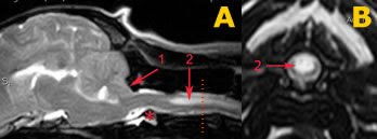 Si tratta di una malattia in genere congenita caratterizzata dalla formazione di una cavità – una “siringa”, appunto – nel tronco encefalico o nel midollo spinale a livello del collo,si estendono in lunghezza per alcuni segmenti del midollo che possono interessare tanto la materai grigia quanto quella bianca La Siringomielia puo’ esistere come entita’ distinta oppure essere in comunicazione con il canale centrale Spesso e’ difficile differenziare le due forme per cui spesso si utilizza il termine Siringoidreomielia. Cause.malformazioni congenite,traumi,infiammazioni e neoplasie,ma puo’ anche essere idiomatica. I segni clinici dipendono dalla sede spinale, il 40% e’ presente dolore spinale. Il cane si isola, ansima, guaisce quando lo si tocca, si gratta con accessi parossistici, sembra inciampare spesso, la testa si abbassa gradualmente e si manifesta una perdita dell’equilibrio, Mano a mano che la malattia progredisce l’animale perde la sensibilità delle zampe anteriori e non riesce a mantenersi in piedi. La muscolatura si indebolisce, sii atrofizza e diventa ipotermica. In più si verifica una diminuzione, più o meno marcata, della sensibilità tattile. Infine la paralisi si estende al tronco posteriore e il cane arriva alla paralisi completa. Alcune razze di cani – come per esempio il Cavalier King Charles Spaniel il Dalmata ed altre razze – presentano una particolare conformazione ( malformazione di Chiari) che rende la parte posteriore della teca cranica e la parte iniziale del canale cervicale più stretta del normale. In questi casi, nella parte posteriore del cervelletto, può facilmente verificarsi un’ernia in cui si raccoglie il liquor – il liquido cerebrospinale che protegge e irrora il midollo spinale – che va a raccogliersi in una specie di cavità. Gradualmente, quest’ultima si espande, continuando a riempirsi di liquor e provocando, con il tempo, gravi lesioni alle fibre nervose.” I sintomi iniziali. “I sintomi della siringomielia sono vari e fino a un certo punto, parzialmente inavvertibili. Solo l’occhio esperto del neurologo può identificare la particolare posizione della testa che il cane affetto da questa patologia assume. Il più delle volte, invece, la sintomatologia viene confusa con manifestazioni di artrosi cervicale, con dolori muscolari o con i sintomi dell’ernia cervicale